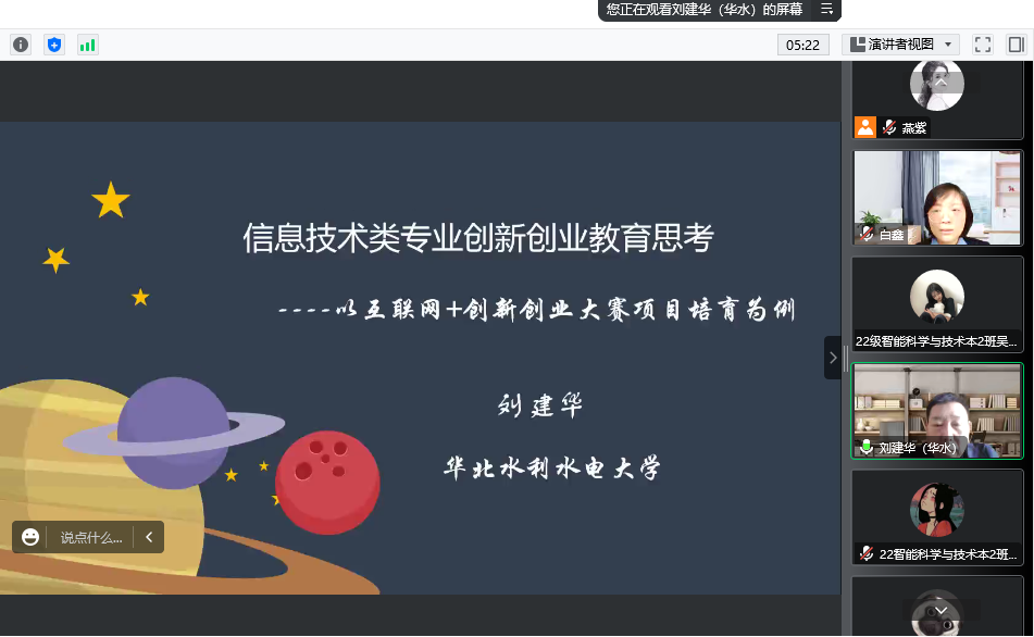 2022年12月14日下午,我院特别邀请了全国就业创业指导委员会委员、河南省创业指导名师——华北水利水电大学刘建华教授,通过腾讯会议给学院师生作了题为《信息技术类专业创新创业思考——以“互联网+”创新创业大赛项目培育为例》的“互联网+”专题报告。