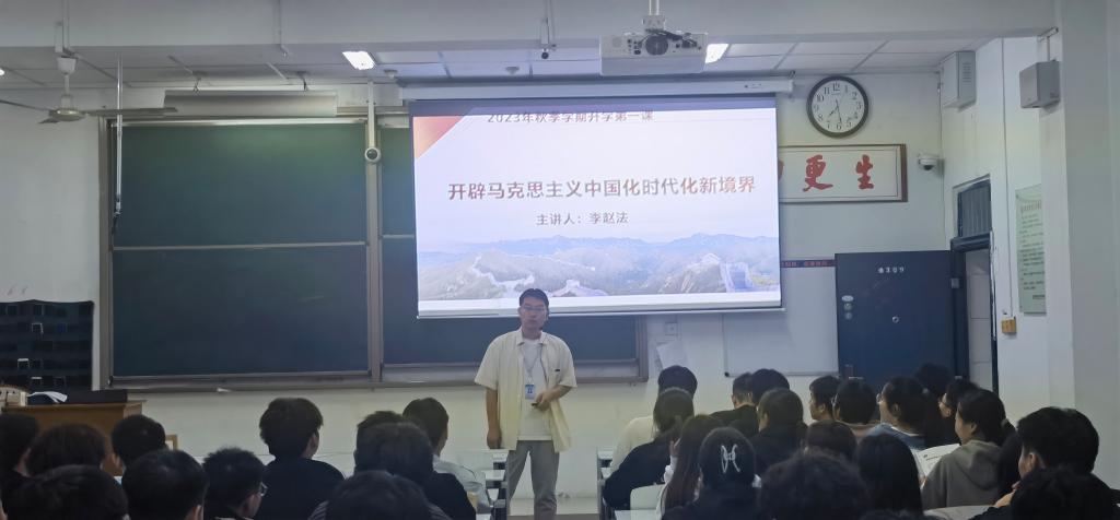 为深入学习领会习近平新时代中国特色社会主义思想,深入学习宣传贯彻党的二十大精神和习近平总书记视察河南重要讲话精神,教育引导青年学生坚定不移听党话、跟党走,努力成长为新时代好青年,10月7日上午,太阳成集团tyc33455ccww党委书记李赵法在综合楼309教室给21级物联网工程本科1-2班学生讲了题为《开辟马克思主义中国化时代化新境界》的秋季学期开学思政第一课。