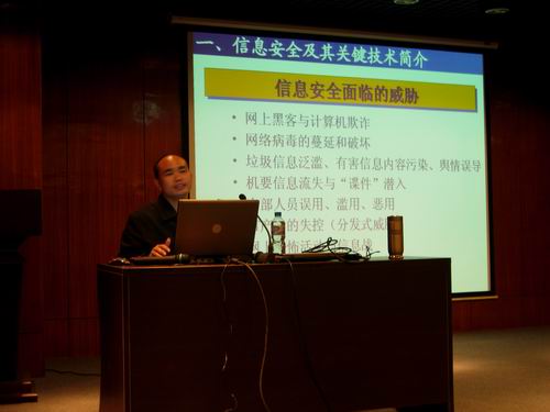 李教授从信息安全及其关键技术,垃圾文件过滤技术,不良网页(网站)过滤技术,互联网视听节目监管技术和网络舆情态势分析与预警技术等五个方面为同学们讲解了信息安全的最新技术,他以自身的项目经验和课题入手,并用网络上的实例为同学们展示了一场信息安全技术的变革。他还讲到网络舆论对社会舆论的影响:能提供更为广阔的意见通道;能很快引起全社会的普遍关注及事件的合理终结;能推进政治民主;对优秀文化的承传、良好社会风气的塑造及网民的文化诉求都负有重要社会责任。但同时网络舆论也存在一些隐患:网络信息洪潮淹没人的理性,有时会为少数怀有不良意图的始作俑者,歪曲促进社会改良与伸张正义的善良意旨;网络安全令人担忧,黑客绕进安全防火墙向各大网站发动恶意攻击,诸如机秘泄露、网络侵权、网络健康等问题亟待关注。李教授的报告贴合我系学科特点和同学们的日常生活,内容生动,博得了大家的阵阵掌声。