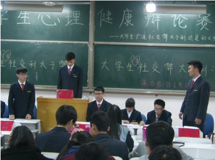 2015年10月29日晚,由院心理健康教育中心主办,信工系承办的以“大学生心理健康”为主题的辩论赛在资讯楼116教室顺利举行。此次比赛特邀信工系团学副主席董菲菲、宋月茹,系组织部部长侯俊鑫作为嘉宾出席此次比赛。
