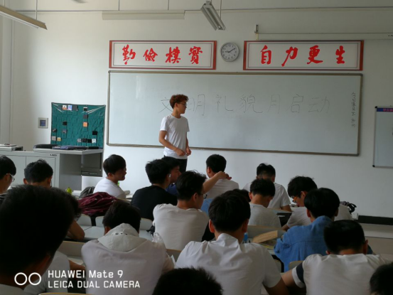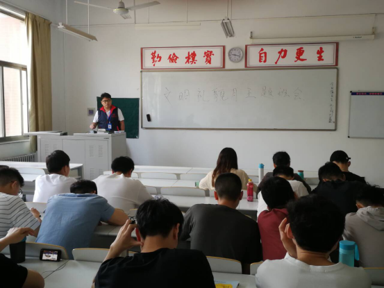 班会上,首先由各班辅导员介绍了“文明礼貌月”的活动内容,同时对同学们提出了具体的要求。如同学之间要相互问好,出入寝室楼、教学楼时向管理员问好等,要将“微笑、行礼、问候”贯穿于日常生活学习中去。接着,也向同学们阐述了开展“文明礼貌月”的重要意义,并对同学们提出了殷切希望。要求同学们加强对自身文明礼貌的培养,重视自己的一言一行。同时,也希望同学们通过本次文明礼貌月活动能够养成良好的学习和生活习惯,争做“文明礼貌先进个人”。