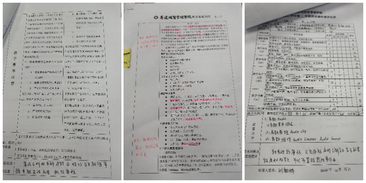 在本次期中教学检查中,物联网教研室与数据科学与大数据技术教研室进行期中教学材料互查。其中,刘敏娟老师不论教案、讲稿还是听课记录表,内容都十分充实。教案清晰地阐述教学目标,包括知识目标、能力目标和两性一度的价值观目标。这些目标具体并符合学生的认知水平和学科要求。教学思路体现了教学过程的逻辑性和连贯性,从学科知识的内在逻辑出发,合理安排了教学内容和教学步骤。讲稿内容详细,重难点通过案例进行引入;对于重难点有突出标注,且有思考环节,使对复杂的问题进行分解和综合,从而达到了教学突出重点,突破难点,循序渐进地体现由浅入深、从简到繁、由易到难的过程。听课记录记录详细记录了课程的所有关键环节,反应了真实的教学情况,没有主观偏见和个人情感色彩;记录条理清晰,逻辑性强,能够按照教学活动的流程顺序记录;突出了教学的重点和难点,以及教师是如何突破这些重难点的。对听课记录进行全面的分析和评价,确保教学质量的持续提升和教师专业发展。