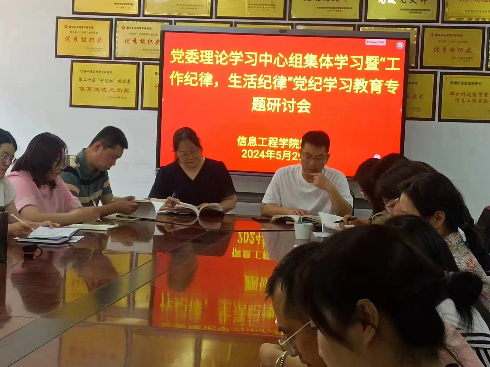 为推动党纪学习教育走深走实,提升广大党员干部遵规守德意识。5月29日下午,太阳成集团tyc33455ccww党委理论学习中心组(扩大)学习围绕“工作纪律、生活纪律”开展集体学习研讨。本次会议由学院党委书记李赵法主持,党委中心组成员及各支部书记参加会议。