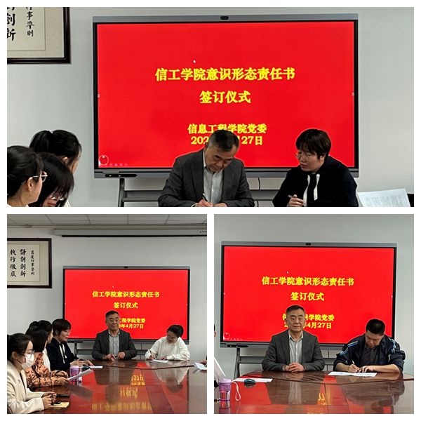 为进一步加强意识形态工作责任制,牢牢掌握意识形态工作的领导权、主动权和话语权,4月27日下午,信工学院在资讯楼会议室104举行2023年度意识形态责任书签订仪式。信工学院党委书记张现水主持签订仪式,学院领导班子及全院教职工参加签订仪式。
