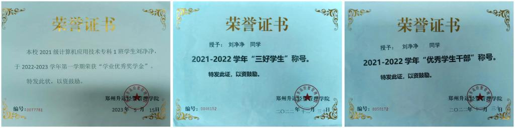 “学海无涯勤是岸,青云有路志为梯”是她的人生信条,她结合学科优势,将专业知识运用到竞赛当中,并先后获“第十三届蓝桥杯省赛单片机大赛本科组三等奖”和“第十四届蓝桥杯省赛单片机大赛本科组三等奖”。她认为“业精于勤,荒于嬉”,所以暑假期间她也不曾松懈,利用假期留校备赛,先后参加了“2023年全国大学生电子设计竞赛”、“2023年‘高教杯’全国大学生数学建模竞赛”。刘净净一直秉持着服务同学、服务学校的态度,勤勤恳恳,兢兢业业的工作。从班级副班长到校电子协会干事,她从不计较个人得失,时刻以服务同学、奉献集体为宗旨。大一她便加入校电子协会,“赠人玫瑰,手有余香”是身为电子协会社员的光荣使命,她用自己的行动诠释着这种精神。在这个平台,她学习到了更多技能,她将这里学到的技能,进一步学以致用,尽自己所能去帮助他人,凡是需要帮助的同学,她都耐心地为他们答疑解惑。作为班级副班长,她协助老师和班长开展各项班级工作。在学校疫情严峻时期,她勇于担当责任和使命,积极安抚同学情绪,帮助同学们解决生活问题,引导同学们掌握防疫知识,科学应对疫情。她自己从来没有让自己懈怠,一直努力做自己喜欢的事,不断去尝试新的东西,积极参加学校组织的活动和比赛。