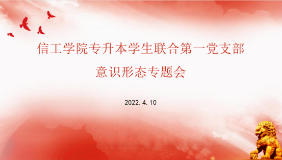 为进一步激发党支部宣传工作活力,加强和改进意识形态工作,推动宣传工作制度化,规范化,科学化。4月10日下午4点,信工学院专升本学生联合第一党支部组织开展意识形态专题学习线上会议,支部全体党员、预备党员参加会议,会议由专升本学生联合第一党支部书记宁珂主持。