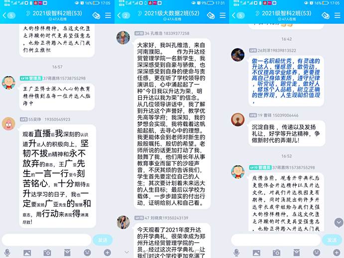 在收听收看完开学典礼之后,我院21级新生在班级群中分享了自己的心得体会,大家纷纷表示,收看这场开学典礼备受鼓舞,同时也体会到了学校对学生的关爱,在今后的大学学习中,将牢记学校的嘱托,踏实拼搏,懂得感恩、不断完善和充实自己,成为新一代优秀的升达人,成为新时代德智体美劳全面发展的社会主义建设者和接班人!