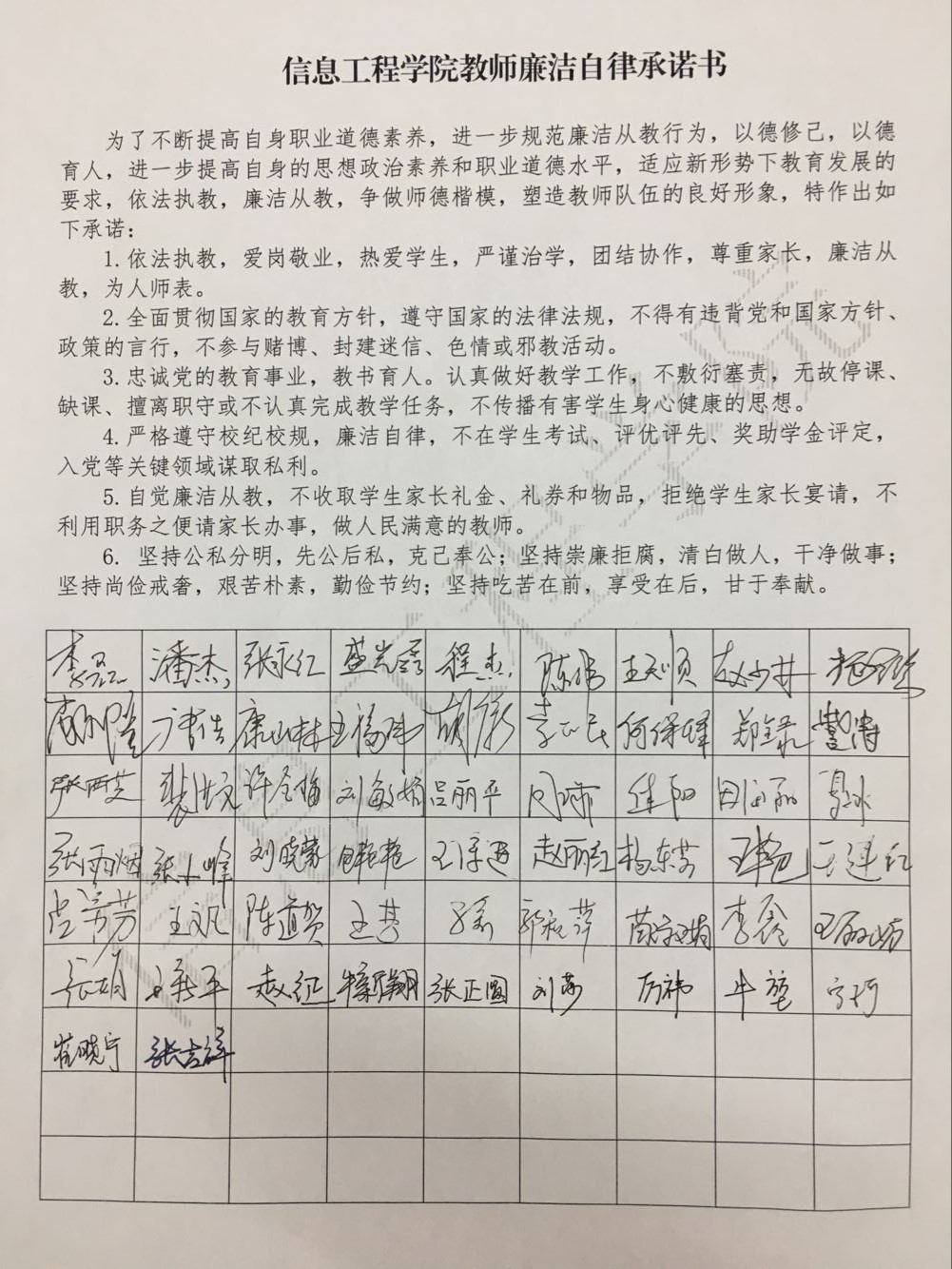 为了不断提高自身职业道德素养,规范廉洁从教行为,以德修己,以德育人,提高自身的思想政治素养和职业道德水平,适应新形势下教育发展的要求。进一步加强教师廉洁自律建设,太阳成集团tyc33455ccww于5月9日下午在我院会议室举行了教师廉洁自律建设承诺书集体签名会议。