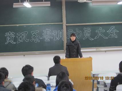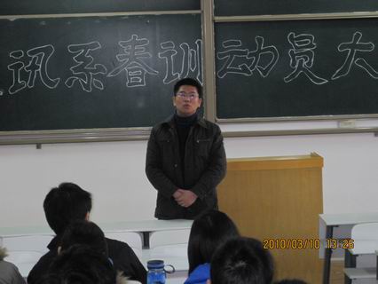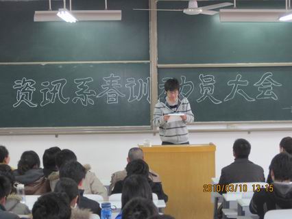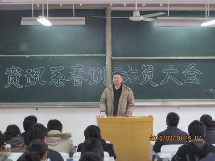 “黄河之滨集合着一群中华民族优秀的子孙……”阳春三月,微风拂面,在雄壮的资讯系系歌——《抗大校歌》的歌声中,3月10日中午1点,在资讯楼106室我系隆重召开2010年春训动员大会。出席会议的领导有系主任冷建华教授,党总支书记魏民同志,党总支副书记王新平老师,行政秘书、团委书记陈刚老师,团委副书记、09级辅导员曹丹丹老师及06至09级各年级团总支书记、我系团委学生会主席团成员、各部门部长和我系全体田径队队员。出席此次会议的领导阵容之强大实属空前,充分体现了我系全体党政领导的高度重视。