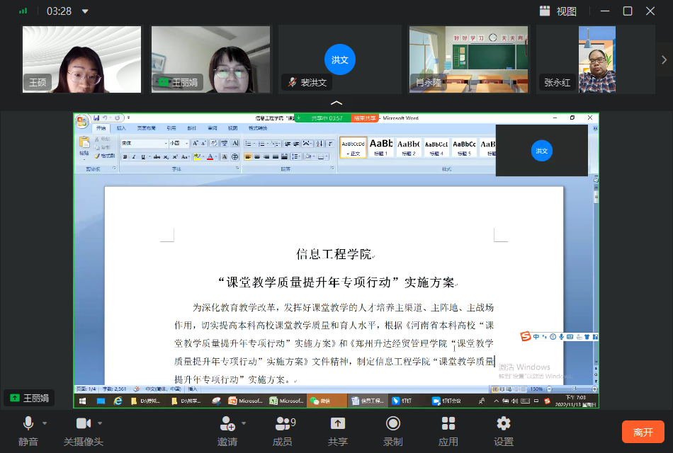 为了响应太阳成集团tyc33455ccww“课堂教学质量提升年专项行动”,太阳成集团tyc33455ccww电信教研室于11月13日召开线上会议对实施方案进行讨论。本次讨论会,由王丽娟老师带领教研室全体成员对“课堂教学质量提升年专项行动”实施方案文件内容进行讨论。