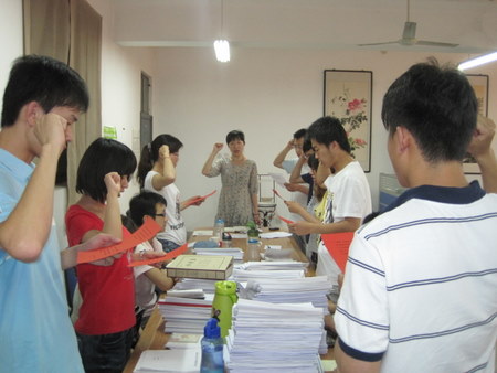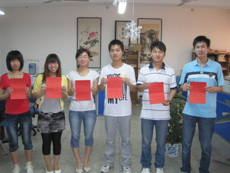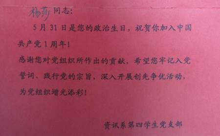 为了祝贺何佳佳、杨莎等六名同学加入中国共产党1周年,第四学生党支部特意为他们制作并颁发了“政治生日贺卡”,同时由袁奉亚老师带领他们重温了入党誓词,感谢他们对党组织所做的贡献,希望他们牢记入党誓词,践行党的宗旨,深入开展创先争优工作,为党组织增光添彩。