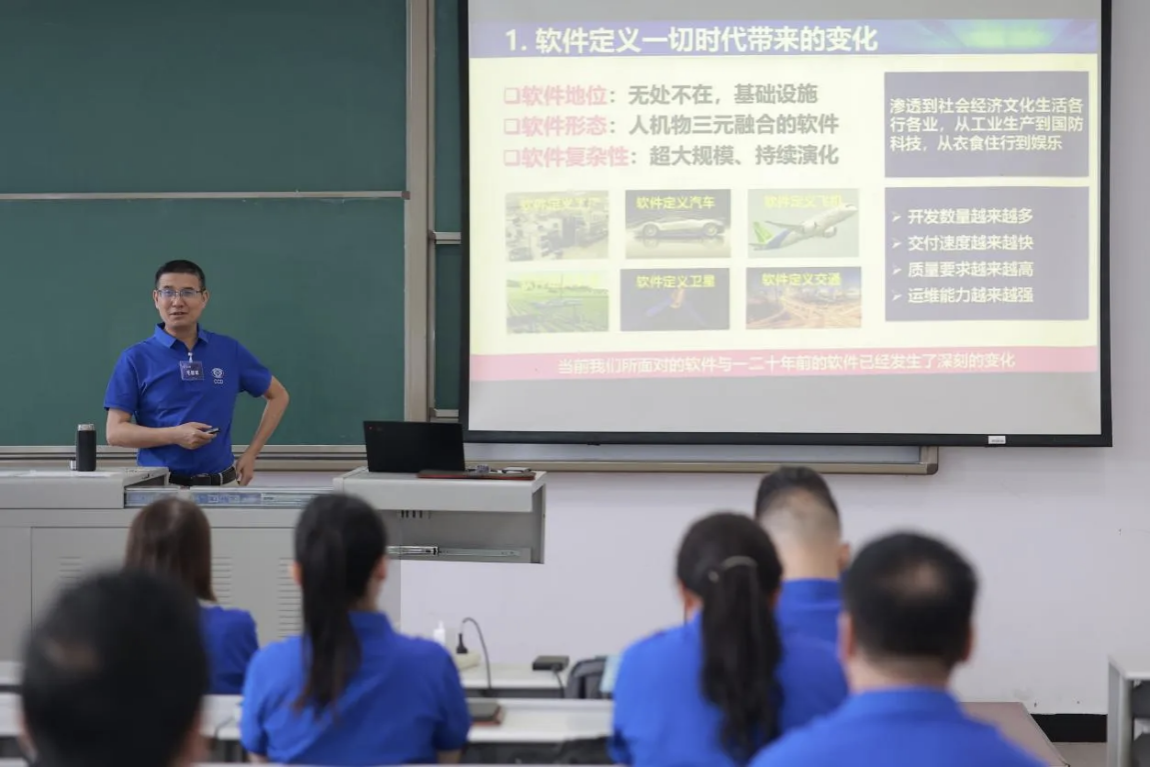 培训中,毛新军教授详细解读了“软件定义一切”时代带来的深刻变化——软件已成为无处不在的基础设施,渗透到社会经济文化生活的各行各业,其形态呈现人机物三元融合的特征,同时面临超大规模、持续演化的复杂性挑战,这对软件的开发数量、交付速度、质量要求和运维能力都提出了更高标准。围绕这些变化,授课团队与参训教师深入探讨了软件工程课程在内容体系和教学模式上的转型方向。