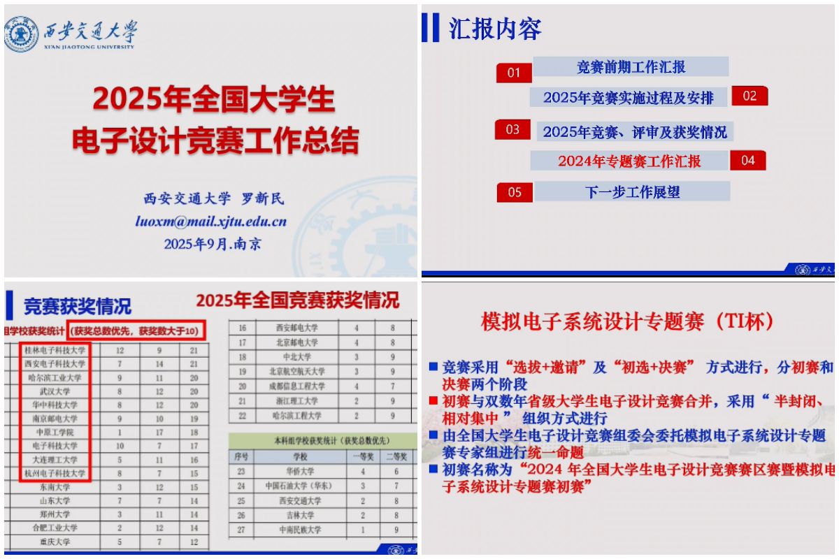 会上,西安交通大学的罗新民教授对2025年全国大学生电子设计竞赛组织工作进行了总结报告。同济大学的岳继光教授对2025年全国大学生电子设计竞赛专家组工作进行了总结报告。德州仪器中国大学计划部经理王沁以中国大学计划引入做了“TI产品与技术助力全国大学生电子设计竞赛”的报告。
