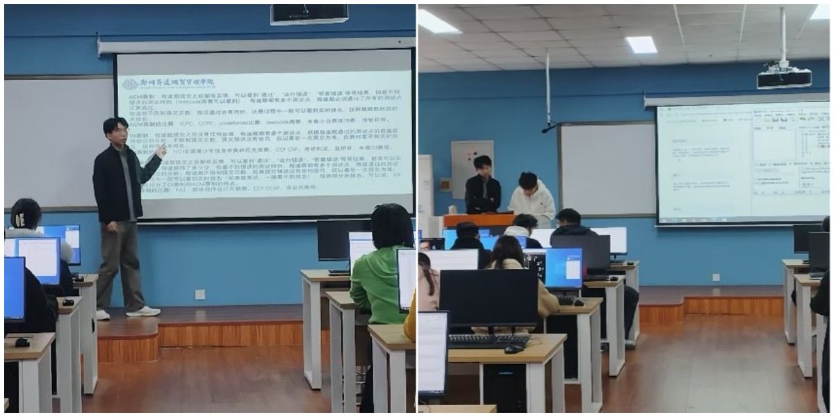 2025年10月25日,ACM协会成员马海正,周佳佳于资讯楼为大数据科学与技术3班新生开展专业竞赛教育。