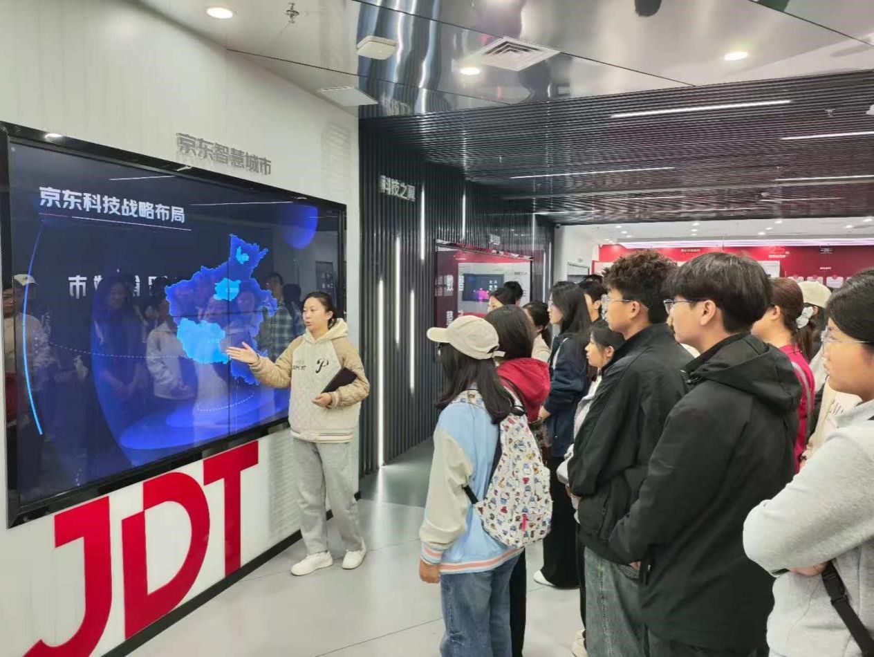 上午,同学们首先抵达充满现代科技感的郑州鲲鹏软件小镇,走进京东(郑州)大厦。在京东相关负责人的引导和讲解下,同学们依次参观了京东的科技创新展厅与办公区域,深入了解了京东在智能供应链、无人仓储物流、大数据分析、云计算服务以及数字人等领域的创新实践,真切感受到了智能技术如何驱动现代商业高效运转。面对这些只在课本上见过的技术化为现实应用,同学们表现出了浓厚的兴趣,纷纷就技术原理、应用场景和人才需求等问题与现场工程师进行了热烈交流。
