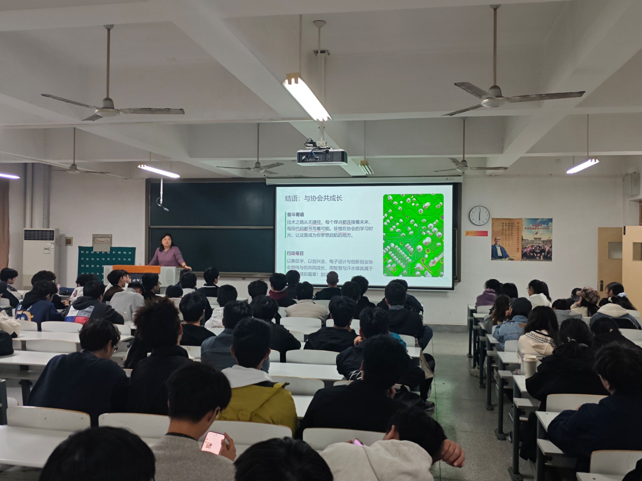 近日,信工学院电信教研室主任田海丽为电子设计协会全体成员(含大一至大三各年级学生)举办了一场内容丰富、目标清晰的协会发展指导讲座。该讲座为成员们的个人成长及协会发展指明了方向。
