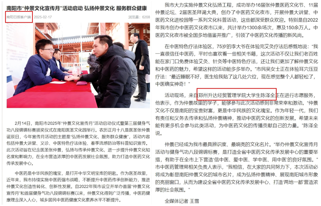 此外,南阳日报也在《南阳市“仲景文化宣传月”活动启动 弘扬仲景文化 服务群众健康》的新闻中专门报道了该生的先进事迹。活动现场,陈泽全同学作为仲景故里的学子,表达了自己参与活动的荣幸与激动之情。他提到,仲景文化是南阳的宝贵财富,更是中华民族的文化瑰宝。作为年轻一代,传承和弘扬仲景精神,推动中医药文化创新发展是自己义不容辞的责任。他也期待未来能有更多机会投身此类活动,为中医药文化传播贡献更多力量。