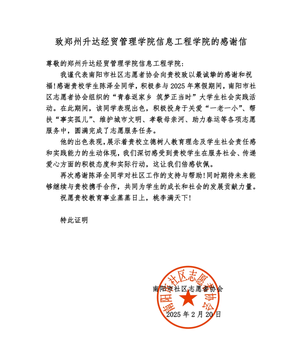 近日,我院收到南阳市社区志愿者协会寄来的感谢信。信中,协会对陈泽全同学在2025年寒假期间的突出表现予以高度赞扬,特别肯定了他在志愿服务期间展现出的专业素养与奉献精神。
