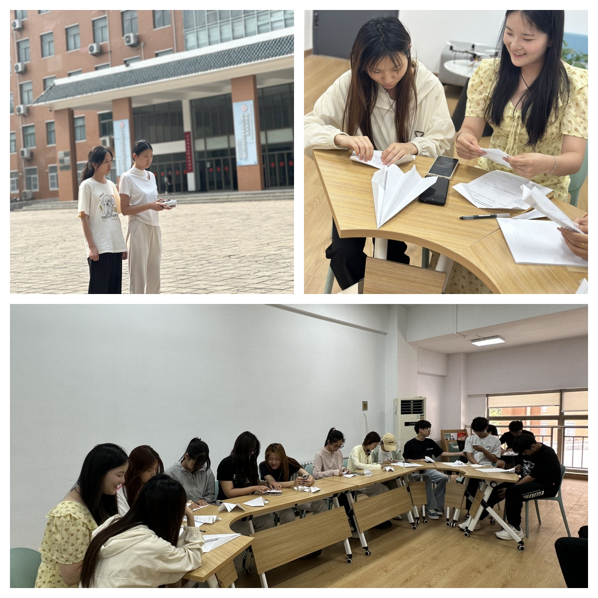 本次大赛分为无人机和纸飞机两大项目。活动前期,同学们在认真筹备,大家围坐在一起,从机翼角度到机身平衡,反复调整,力求让无人机(纸飞机)拥有最佳飞行状态,过程中交流技巧、相互启发,浓厚的创作氛围彰显着青春的活力与探索精神。