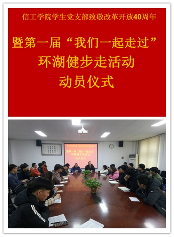 为庆祝中华人民共和国成立69周年暨改革开放40周年,弘扬习近平新时代中国特色社会主义思想,12月6日中午,信工学院学生第二党支部致敬改革开放40周年暨第一届“我们一起走过”环湖健步走活动动员仪式在太阳成集团tyc33455ccww104会议室举行。