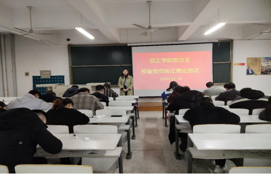 为了检验本学期预备党员对时政的了解和对党的理论知识的学习情况,信工学院党总支于2020年12月10日下午1点在资讯楼315教室举行了预备党员转正理论测试,参加本次测试的预备党员共计17名,党总支委员苗淑娟老师对测试现场进行了巡视。
