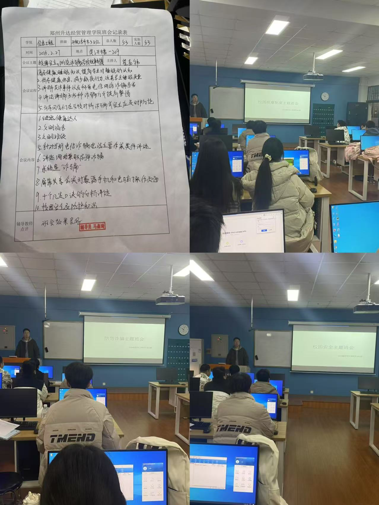 班会召开聚焦“网络安全”“预防校园欺凌”及“校规校纪遵守”等贴近学生实际的主题,通过案例分析、互动交流等形式展开。辅导员围绕主题深入解析,引导学生结合社会热点与身边实例展开讨论。有时谈及网络诈骗场景,大家一起探讨如何识别风险、保护个人信息;面对校园欺凌等问题,同学们也会各抒己见,相互交流解决问题的方法,在相互表达中,凝聚共识,共同学习法律知识。此外,教师们与同学们共同梳理校规校纪,帮助学生们更好地融入校园生活。