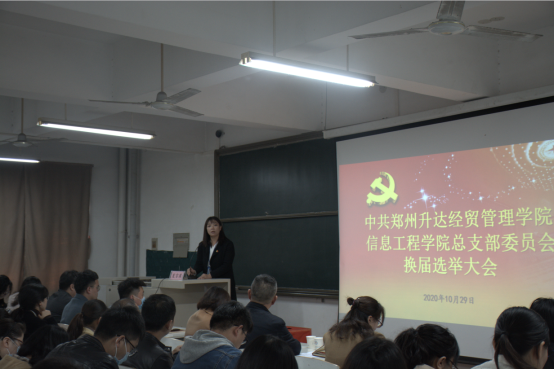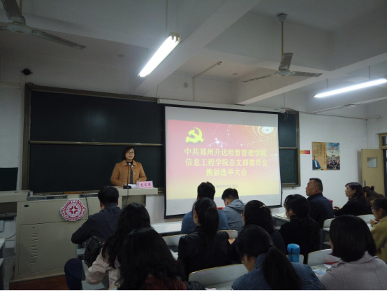 校党委委员、党委办公室主任、组织部部长秦旻同志发表讲话,她指出我院换届选举大会符合程序,并对信工学院党总支过去的工作和所取得的成绩表示充分肯定,对新一届信工学院总支部委员会工作提出希望:希望新一届党总支委员会牢记初心使命,不断砥砺前行,进一步深入落实“围绕中心抓党建,构建和谐促发展”,不断增强党组织的凝聚力、战斗力,以强烈的使命感、责任感奋力前行,以崭新的风貌,良好的作风,出色的工作,向信工学院全体党员交出一份满意的答卷。