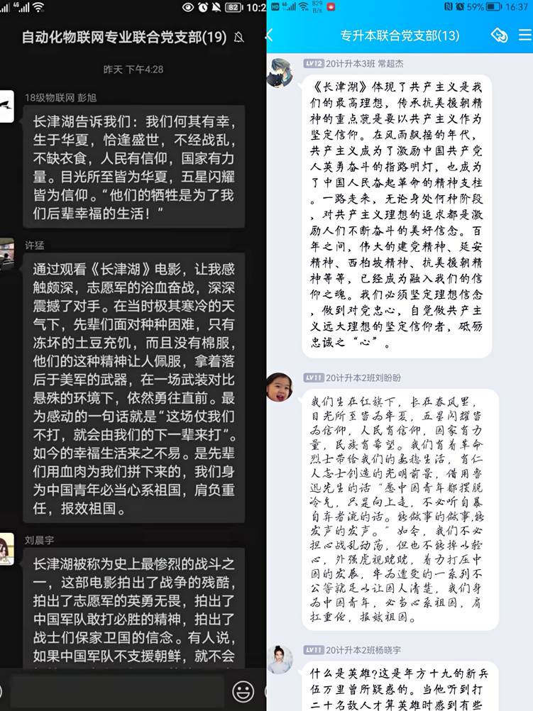 观影结束后,学院以支部为单位通过线上讨论、主题座谈会、撰写观影心得的方式进一步分享学习心得,进一步引导党员干部坚定理想信念。师生党员纷纷表示,要珍惜英雄们拼命换来的无恙山河,从百年党史中汲取前进力量,以实际行动践行初心使命。