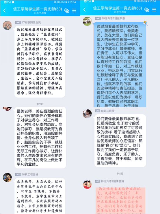 为贯彻落实全国、全省教育大会精神,弘扬伟大的抗“疫”精神,信工学院各学生支部于9月12日晚组织师生收看第36个教师节表彰大会暨“出彩河南人”2020最美教师发布仪式,并在发布仪式结束后结合各支部实际,认真收看学习《出彩河南人2020最美教师》事迹展播。