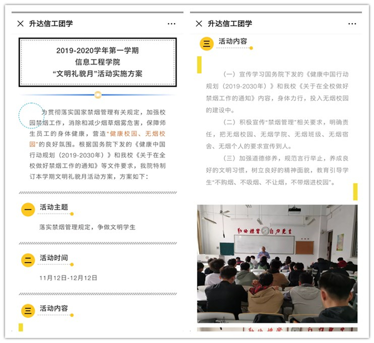 为提高信工学院学生的文明素养和道德水平,营造文明、优雅的校园学习生活环境,响应我校文明礼貌月活动有关要求,加强校园禁烟工作。11月13号—11月19日,信工学院积极开展以消除和减少烟草烟雾危害,保障自己和他人的身体健康,营造“健康校园、无烟校园”的良好氛围为主题的各项活动。