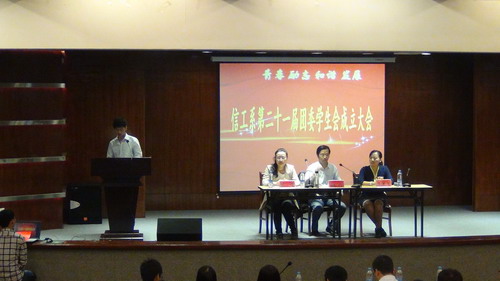 10月9日下午2点半,信工系在外语楼一楼多功能报告厅隆重召开了第21届团委学生会成立大会。出席大会的有党总支魏民书记、王新平副书记、行政秘书兼团委书记张娟老师、团委副书记李磊老师、12级年级团总支书记苗书娟老师、13级年级团总支书记厉祎老师、13级辅导员崔晓宁老师、14级辅导员张世昌老师和第21届团委学生会全体成员。会议由团委副书记张硕主持。