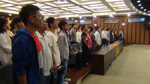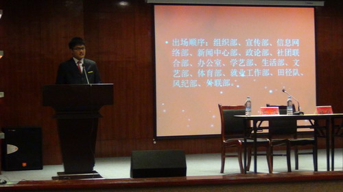 大会在激昂的共青团团歌声中拉开序幕。首先,魏民书记发表重要培训讲话。他首先列举了往届优秀团学干部的优秀事迹,以此号召团学干部要摆正自身位置,努力工作,好好学习,处理好工作和学习的关系,成为一个德智体全面发展的人才。魏书记希望团学成员要努力做到“六视”:即“视任命为信任,视信任为责任,视责任为使命,视使命为生命,视生命为舞台,视舞台为圣地”。他殷切希望大家要怀有感激之情,报答之心,为团学工作增光添彩;要“敢干,肯干,实干”,以饱满的热情,高昂的精神投入到学习工作当中去,为院系的和谐发展奉献自己的力量。魏书记热情洋溢的讲话使大家受益匪浅,获得了阵阵掌声。