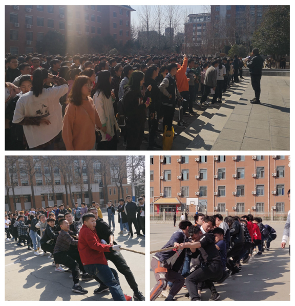 为庆祝中华人民共和国成立70周年暨五四运动100周年,弘扬五四精神,加强学生的思想道德建设,营造良好的校园文化氛围,信工学院于3月14日下午两点在北生活馆篮球场举办团支部拔河比赛。16级辅导员王保进、17级辅导员牛新翔、18级辅导员王建红、张吉祥和团委副书记左金磊、学生会主席魏广州、副主席常向凯出席了本次活动,17、18各班团支部参加了本次比赛。