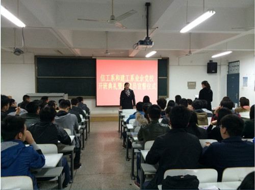 3月18日晚6点半,信工系和建工系第31期党校开班典礼暨新党员宣誓仪式在资讯楼312教室隆重举行。与会的有信工系党总支王新平副书记、建工系行政秘书赵杨老师、信工系团委书记、行政秘书张娟老师及全体辅导员老师。典礼由总支委员苗淑娟老师主持。