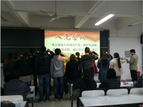 典礼在庄严嘹亮的《国际歌》声中开始。接着,张娟老师宣读党委批复和参加新党员宣誓的名单。在我系党支部书记李磊老师的带领下,15名新党员代表有序来到党旗前,举起右手,握紧拳头,面向党旗庄严宣誓。