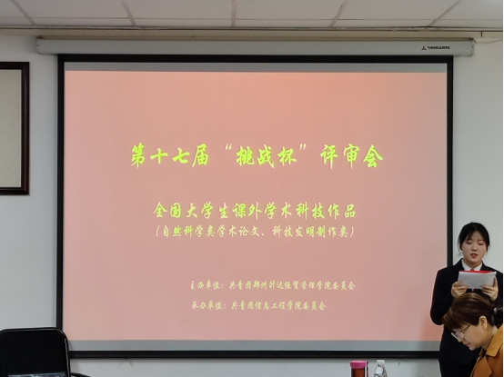 2021年4月15日下午2点,有校团委主办,信工学院团委承办的第十七届“挑战杯”大学生课外学术科技作品(自然科学类学术论文、科技发明制作类)竞赛校内赛在资讯楼104会议室顺利举行。参加活动的评委有建工学院的副院长高燕副教授,高工建造师、实验师老师,杨爱丽交通学院的高级工程师张耀武老师,信工学院的王丽娟副教授,贾超广副教授,程杰副教授,王天顺副教授。