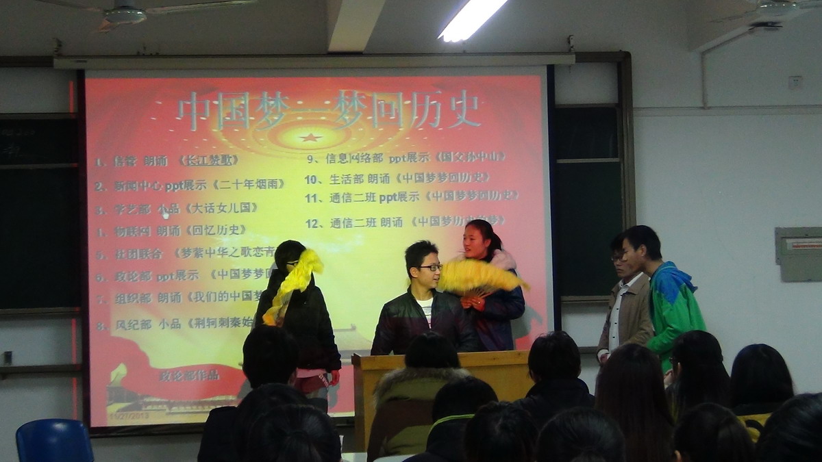 11月27日晚上6:30,由信工系团委主办、系政论部承办的“我的中国梦——梦回历史”活动在资讯楼312教室展开了精彩的表演。系行政秘书兼团委书记张娟老师、第二十届团学成员参加了本次活动。