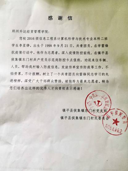 近日,信工学院收到一封来自南阳市镇平县侯集镇东门村党支部以及村民居委会的联名感谢信。信中对我院2016级计算机科学与技术专业本科2班李星铮同学在疫情期间积极参与疫情防控工作给与了高度评价,表示了诚挚的感谢。