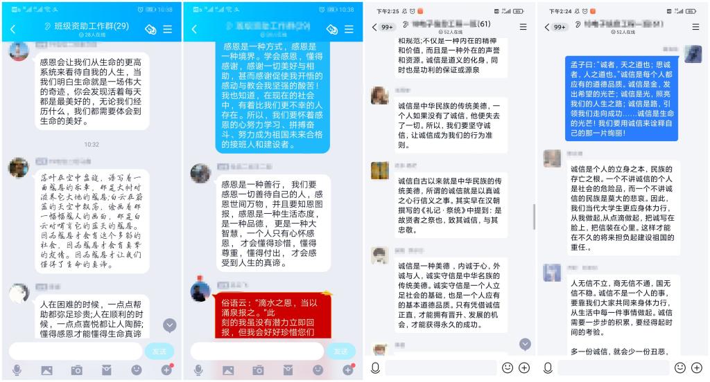 辅导员组织学生们通过线上讨论,线下主题班会的形式开展此项活动,对国家、学校资助政策进行宣讲,就信用助学贷款的金融知识、还贷政策、逾期风险,以及防范金融诈骗等内容进行了解读,并在互动环节对学生们提出的问题进行了解答,引导学生们学会感恩奉献,树立正确受助观念,号召同学们坚定理想信念,发扬艰苦朴素、勤俭节约的精神。学生们通过身边人、身边事总结心得,分享诚信、感恩、励志的故事,加深了对资助政策的理解,激发了对祖国、对学校的感激之情。