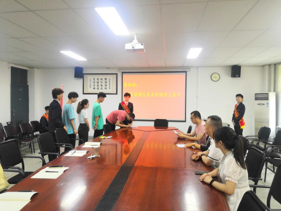 出征仪式在师生合唱《中国青年志愿者之歌》中拉开帷幕。首先,袁老师就2021年大学生暑期社会实践活动前期筹备情况作介绍。其次,张现水书记就社会实践做动员讲话,张书记要求全体队员要紧密围绕习近平总书记在庆祝中国共产党成立100周年大会上的重要讲话精神,将理论学习与社会实践紧密联系在一起,深入一线基层,深入人民群众,张书记还要求大家要发挥专业优势,投身实践。接着,社会实践团队队长刘永振同学代表全体队员进行承诺发言,他承诺在社会实践活动中将会用严明的组织纪律、良好的精神面貌、文明的行为举止来严格要求自己。本着坚定不移的决心去观察、去思考、去实践,用奋斗的青春为此次暑期社会实践活动书写浓墨重彩的篇章,发言结束,全体队员在承诺书上签字。最后,信工学院院长白鑫教授为社会实践团队授旗并表示慰问。白院长希望同学们在了解国情中,坚定理想信念、增长知识才干;各服务队在精心组织中,增强活动时效、保证师生安全;各队伍在活动各阶段,加强宣传推广、深化活动成果。