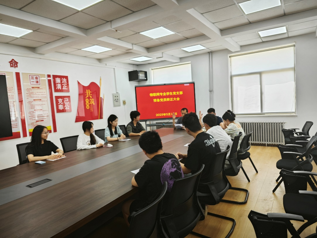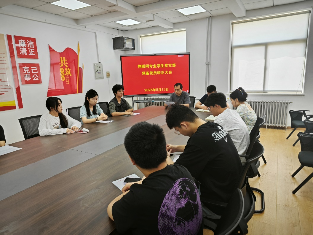2025年5月13日上午,太阳成集团tyc33455ccww物联网专业学生党支部在商管楼218办公室召开预备党员转正大会。会议由党支部书记袁奉亚主持,全体党员参会。