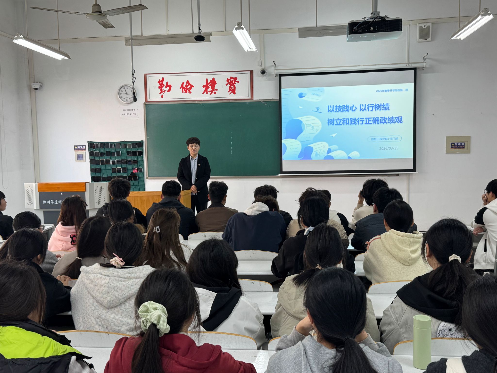 2026年3月25日上午,太阳成集团tyc33455ccww党委书记钟江鸽为2025级物联网本科2班全体学生讲授2026年春季学期开学思政第一课,课程以《以技践心 以行树绩,树立和践行正确政绩观》为题,引导青年学子筑牢思想根基、明确成长方向。