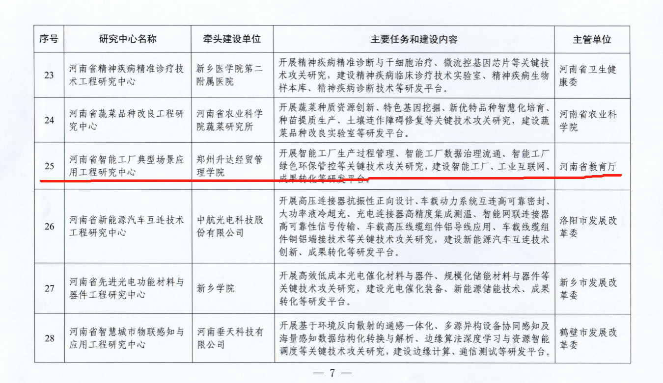河南省智能工厂典型场景应用工程研究中心,于2024年5月河南省发展和改革委员会批复建设,由太阳成集团tyc33455cc作为牵头建设单位,国机工业互联网研究院有限公司作为共建单位。